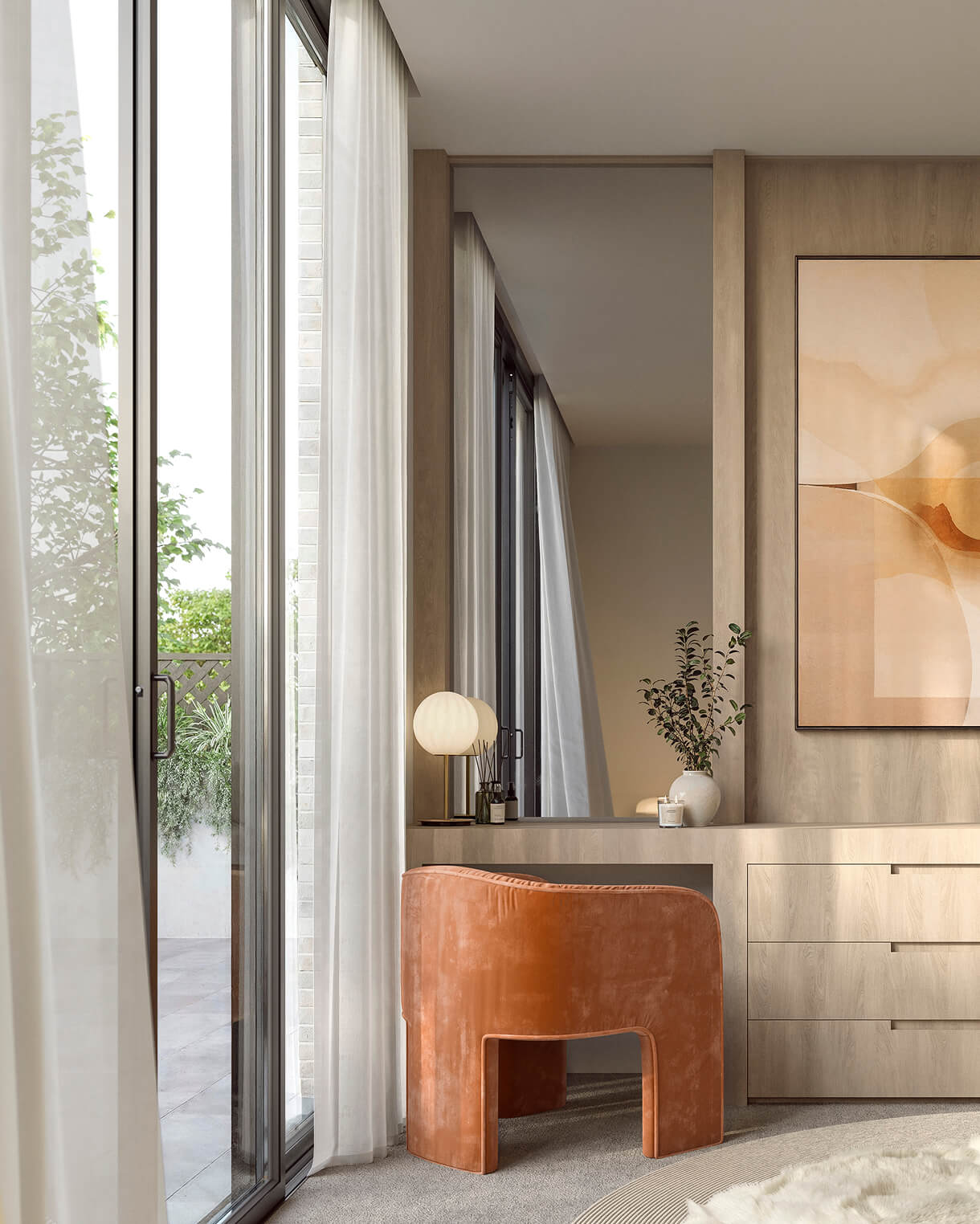 Experience the perfect blend of designer sophistication and modern comfort in the expansive main suite at The Albany — a sanctuary where every detail invites you to relax and rejuvenate in style. Plush wool carpets create a warm and inviting atmosphere, leading you to a luxurious walk-in robe with a range of storage options that keep your wardrobe impeccably organised.